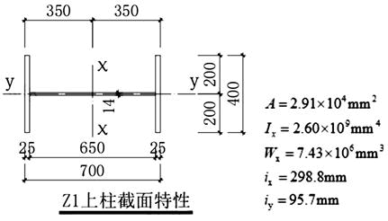 假定,Z1上柱在框架平面外的计算长度l0y=7940mm,取等效弯矩系数βtx=1.0,其余条件同题19。试问,以应力比形式表达的Z1上柱在弯矩Mx作用平面外稳定性计算值,与下列何项数值最为接近?( )