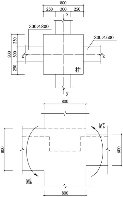 假定,该结构某框架中柱的梁柱节点如图所示,梁钢筋as=as′=60mm,地震作用组合下,节点左侧梁端弯距设计值Mb^l=485.2kN·m,节点右侧梁端弯矩设计值Mb^r=265.8kN·m,节点上、下柱反弯点之间的距离Hc=4100mm。试问,该梁柱节点核心区截面沿x方向地震组合剪力设计值,与下列何项数值接近?( )