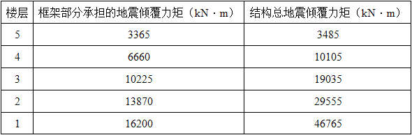 某5层二级医院门诊楼房屋高度20米,采用现浇钢筋混凝土框架-抗震墙结构,该医院所在地区设防烈度为8度,设计基本地震加速度为0.2g,设计地震分组为第一组,建筑场地类别为Ⅱ类,结构安全等级为二级。假定,在规定的x方向水平力作用下,各楼层结构总地震倾覆力矩和框架部分承担的地震倾覆力矩如下表: