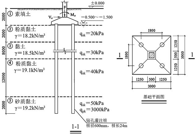 某多层办公建筑,采用钢筋混凝土框架结构及钻孔灌注桩基础,工程桩直径600mm,其中一个4桩承台基础的平、剖面及土层分布如题5~7图所示。