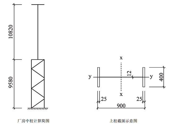 某多跨单层厂房中柱(视为有侧移框架柱)为单阶柱。上柱(上端与实腹梁刚接)采用焊接实腹工字形截面H900×400×12×25,翼缘为焰切边,截面无栓(钉)孔削弱,截面特性:A=302cm2,Ix=44329cm4,Wx=9874cm2,lx=38.35cm,ly=9.39cm。下柱(下端与基础刚接)采用格构式钢柱。计算简图及上柱截面如题~22图所示。框架结构的内力和位移采用一阶弹性分析进行计算,上柱内力基本组合设计值为:N=970kN,Mx=1706kN·m。钢材采用Q345钢,εk=0.825,不考虑抗震。
