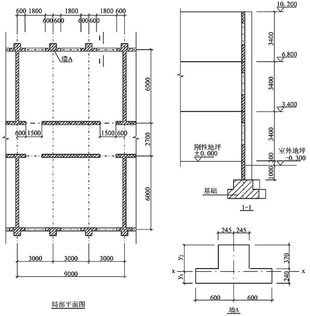 某三层砌体结构局部平、剖如题~25图所示,各层平面布置相同,各层层高均为3.40m;楼、屋盖均为现浇钢筋混凝土板,底层设有刚性地坪,静力计算方案为刚性方案。纵横墙厚度均为240mm,采用MU10级烧结普通砖、M7.5级混合砂浆建筑,砌体施工质量控制等级为B级。