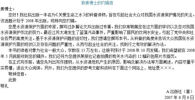 案例题 写作题:根据所给材料撰写约稿信(出版社的具体地址、邮政编码、电话号码、电子信箱地址、网址等一律用×××代替。)