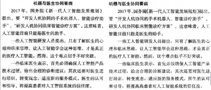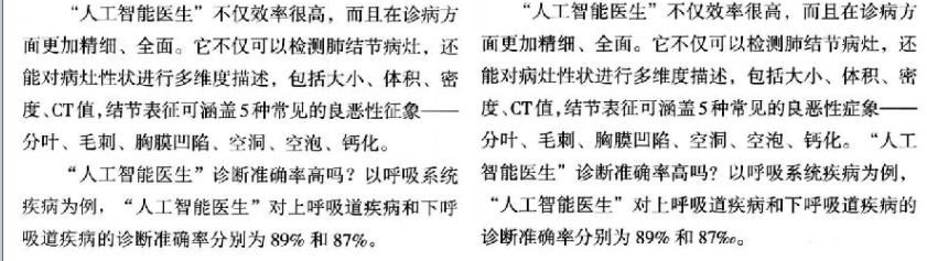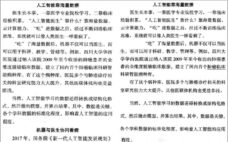 (1)标题加黑加大字号与原稿一致(2)诊断建议…改为“诊断建议……”(3)年青——年轻(4)CT改为正体(5)1分半钟——1.5分钟(6)结节表征后面加逗号(7)5种——6种(8)症象——征象(9)“人工智能医生”诊断准确率高吗?——开始另起一段(10)第二一个“一靠”改为“二靠”;(11)“吃”了海量数据后,段首空两格;(12)肺癌临床下划线去掉(13)受益非浅——受益匪浅(14)当然开始,行距改为与上文同;)(15)机器医生协同看病,标题居中(16)研发人机协同——加上前半个双引号;(17)提高高——提高