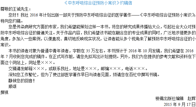 棱镜出版社医学编辑室编辑赵辉提出一个中东呼吸综合征方面的选题,经选题论证,列入了选题计划。