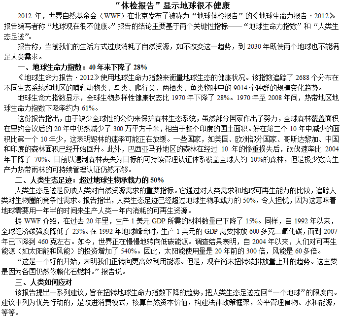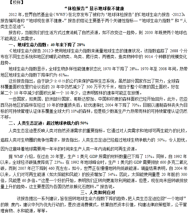 (6)删去“全球生物多样性能健康状态比1970年下降了28%”中的“能”字。