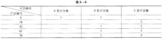 不定项选择题 对某产品进行抽样验收,根据质量特性重要程度的不同,将检验项目分为A类、B类和C类不合格,对A类不合格的抽检方案为(80,1),B类不合格的抽检方案为(80, 5),C 类不合格的抽检方案为(80, 8),检验员从一批产品中抽取80件产品,其中发现5个产品有不合格,不合格情况如表6-6所示。[2008年真题]