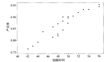 小组进一步研究发现和各个班组反应槽的加温时间不同。小组怀疑温度可能是影 响产出率的主要因素,为此小组收集了加温时间与产出率的数据,绘制了散布图 (见下图),从图上可以看出( )。