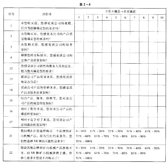 不定项选择题 ZH机械制造总厂聘请第三方咨询机构对其生产的XR牌机械产品进行全国满意度调查, 此次顾客满意度专项调查由品牌形象、预期质量、感知质量、感知价值、顾客满意、顾客忠 诚等六个结构变量构成测评模型。其调查问卷部分问题如表2-4所示。[2006年真题]
