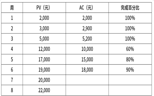 某项目计划8周完成,项目经理就前6周的项目进展情况进行分析和汇报如下: