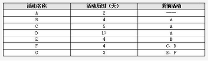 因公司进行一个项目其包含A,B,C,D,E,F,G七个活动,各活动的历史估算和活动间的逻辑关系如下表所示,该项目的工期是