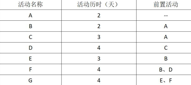 某项目包含A、B、C、D、E、F、G共7个活动,各活动历时与逻辑关系如下表所示。活动B的自由浮动时间与E的总浮动时间分别