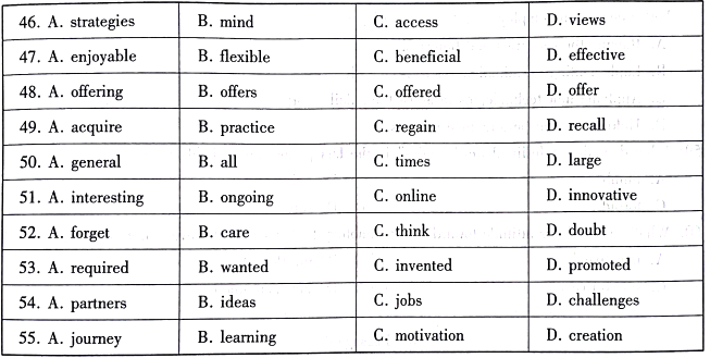 6.B 解析:根据后文表达 “我们应当视教育为一生追求,而非仅仅在年轻时候……” 可知在这里作者呼吁应当把教育过程变为持续的过程。选项 A:有趣的;选项 B:持续的;选项 C:在线的;选项 D:创新的。结合句意可知正确答案是选项 B。