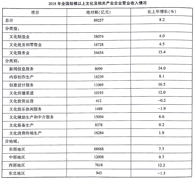 不定项选择题 据对全国规模以上文化及相关产业 6.0 万家企业调查,2018 年,上述企业实现营业收入 89257 亿元,比上年增长 8.2%。