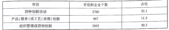 在有创新活动的2760个企业中,组织管理创新或营销创新的企业为2603个,占有创新活动的企业总体的比重为94.3%。其中,有组织管理创新活动的企业为1901个,占有创新活动企业总体的比重为68.9%;有营销创新活动的企业为1886个,占比为68.3%。