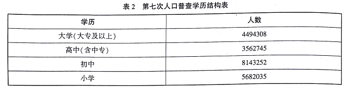 全区常住人口中,拥有大学(大专及以上)文化程度的人口为4494308人;拥有高中(含中专)文化程度的人口为3562745人;拥有初中文化程度的人口为8143252人;拥有小学文化程度的人口为5682035人(以上各种受教育程度的人包括各类学校的毕业生、肄业生和在校生。与2010年第六次全国人口普查相比,每10万人中拥有大学文化程度的由10208人上升为18688人;拥有高中文化程度的由15215人下降为14814人;拥有初中文化程度的由39218人下降为33861人;拥有小学文化程度的由25418人下降为23627人。