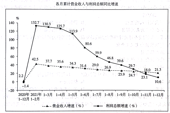 2021年,规模以上工业企业实现营业收入52125.4亿元,同比增长21.3%;发生营业成本45918.9亿元,增长22.5%。