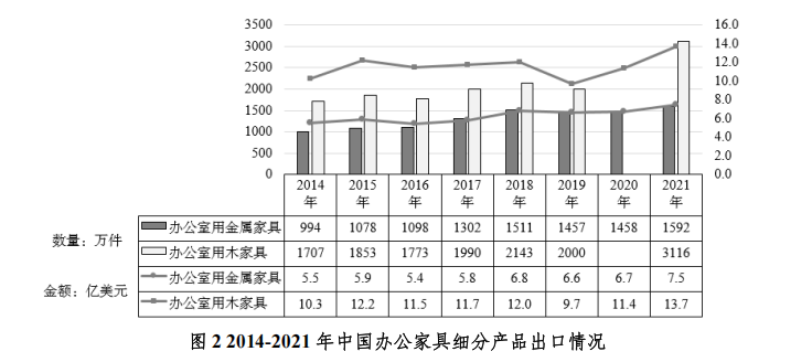 办公室用金属家具。2014-2021年中国办公家具出口情况总体呈上升趋势。中国办公家