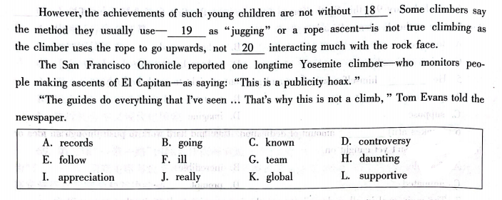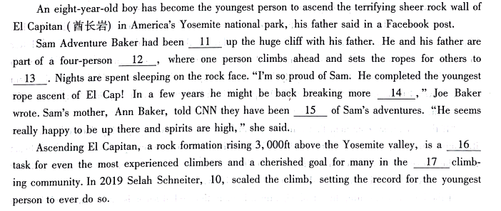 17. K 解析:根据空格前面的 the 和空格后面的 climbing community 可知,空格处应填形容词,仅剩 global 可选。