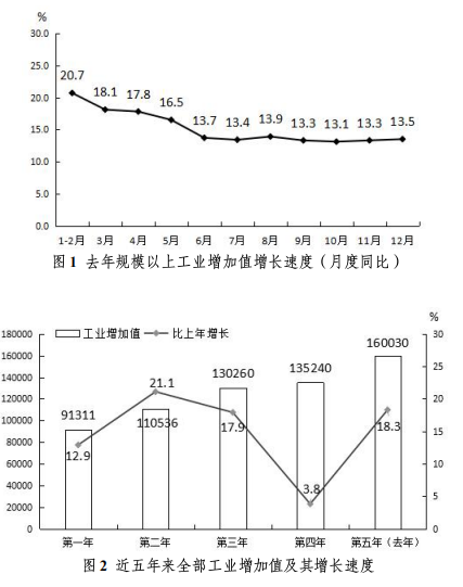 资料分析 去年,全年全部工业增加值 160030 亿元。规模以上工业企业是指年主营业务收入在 2000 万元及以上的工业企业,规模以上工业增加值增长 15.7%。在规模以上工业中,国有及国有控股企业增长 13.7%,集体企业增长 9.4%,股份制企业增长 16.8%,外商及港澳台投资企业增长 14.5%,私营企业增长 20.0%。轻工业增长 13.6%,重工业增长 16.5%。