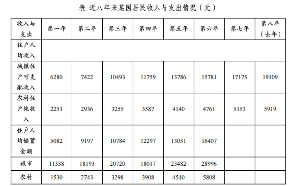 资料分析 据 65000 户城镇居民家庭抽样调查资料显示,去年某国城镇居民家庭人均总收入21033 元,比上年增长 11.5%;扣除价格因素,实际增长 8.0%。其中,人均可支配收入19109 元,比上年增长 11.3%;扣除价格因素,实际增长 7.8%。去年该国城镇居民家庭人均消费性支出 13471 元,比上年增长 9.8%,增速高于上年 0.7 个百分点;扣除价格因素,实际增长 6.4%。
