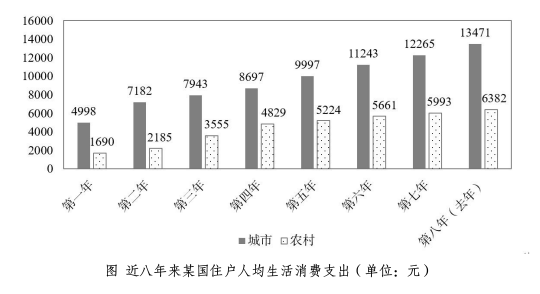 资料分析 据 65000 户城镇居民家庭抽样调查资料显示,去年某国城镇居民家庭人均总收入21033 元,比上年增长 11.5%;扣除价格因素,实际增长 8.0%。其中,人均可支配收入19109 元,比上年增长 11.3%;扣除价格因素,实际增长 7.8%。去年该国城镇居民家庭人均消费性支出 13471 元,比上年增长 9.8%,增速高于上年 0.7 个百分点;扣除价格因素,实际增长 6.4%。