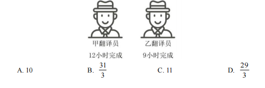 单选题 某公司希望你能帮助他们,把产品介绍翻译成中文。你马上联系了中国的翻译公司,请他们派出 2 名翻译人员进行翻译。甲翻译员单独翻译,需要 12 小时可以完成,乙翻译员单独翻译,需要 9 小时可以完成。如果按照甲先乙后的顺序,每人每次 1 小时轮流进行,你帮他们计算一下,完成这件翻译工作需要( )小时。