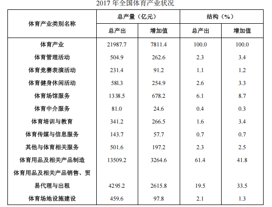 从体育产业内部结构看,体育用品及相关产品制造的总产出和增加值最大,分别为13509.2亿元和3264.6亿元,增长速度分别为12.9%和14.0%。体育服务业(除体育用品及相关产品制造、体育场地设施建设外的9大类)继续保持快速发展势头,增加值在体育产业中所占比重继续上升,从2016年的55%上升到2017年的57%,其中直接与公众体育消费相关的体育竞赛表演活动、体育健身休闲活动增长突出,增长速度分别达到39.2%和47.5%。此外,我国体育场馆、健身步道、体育公园等全民健身设施建设力度不断加大,增长速度达94.7%,反映出我国体育场地设施建设快速蓬勃的发展势头。