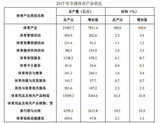 从体育产业内部结构看,体育用品及相关产品制造的总产出和增加值最大,分别为13509.2亿元和3264.6亿元,增长速度分别为12.9%和14.0%。体育服务业(除体育用品及相关产品制造、体育场地设施建设外的9大类)继续保持快速发展势头,增加值在体育产业中所占比重继续上升,从2016年的55%上升到2017年的57%,其中直接与公众体育消费相关的体育竞赛表演活动、体育健身休闲活动增长突出,增长速度分别达到39.2%和47.5%。此外,我国体育场馆、健身步道、体育公园等全民健身设施建设力度不断加大,增长速度达94.7%,反映出我国体育场地设施建设快速蓬勃的发展势头。
