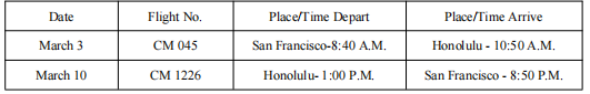 Upon your arrival at Honolulu, your rental car will be waiting for you — just go to the Fritz Rentals service desk. As we discussed, room reservations have been made at the Mahalo Hotel; directions to the hotel will be available at the car rental desk.