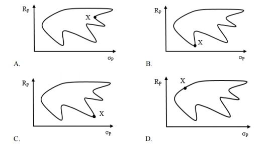 单选题 (2019 建行)根据马柯维茨的金融证券投资理论,证券投资需要满足“有效边界”理论。证券投资的“有效边界”应满足一定的条件:期望收益最大化或者投资组合风险最小化。现有一个临时证券投资组合 X,Rp 表示期望收益,σp 表示风险,则 X 满足有效边界条件的位置是( )。