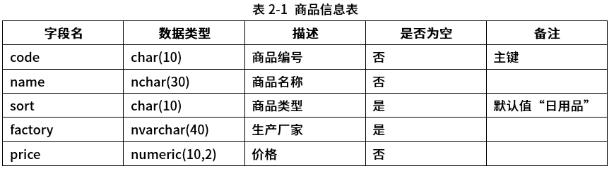 根据表2-1商品信息表可知商品信息表中每一个字段的类型以及部分约束信息,题目要求使用SQL语句的方式来创建goods表,所以空(1)应填写CREATE;商品编号code字段是该表的主键,空(2)应填写PRIMARY KEY;商品名称name字段和价格price字段在插入或更新记录时不允许为空,空(3)应填写NOT NULL;因为商品类型sort字段的默认值为“日用品”,空(4)空应填写default '日用品' ,需要注意的是,在SQL语句中default后边的值应使用单引号或者是SQL的函数调用。