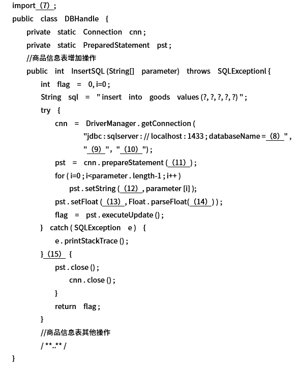 在程序代码中,for循环用于通过setXxx()方法为SQL语句中的参数赋值。由于参数值存储在字符数组parameter中,且商品信息表中的前四个字段都是字符类型,而价格字段是数值型,因此在赋值时需要与字段类型相匹配。循环的终止条件是parameter.length-1,以确保不会超出数组边界。在赋值过程中,空(12)应填写i+1(代表参数的索引,从1开始计数),空(13)也可以填写i+1(但在这种情况下更准确地应该是5,因为价格字段是第五个参数),空(14)应填写parameter[i](或parameter[4],如果是直接为第五个参数赋值的话),分别代表参数的索引和值。