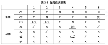 第6空,因此在决策表中给出了多少条件组合情况,相应地也就有多少条规则,即条件项和动作项有多少列。由于每个条件有真、假两种取值情况,所以题目中给出3个条件,则该决策表中需要的规则个数为2*2*2=8。