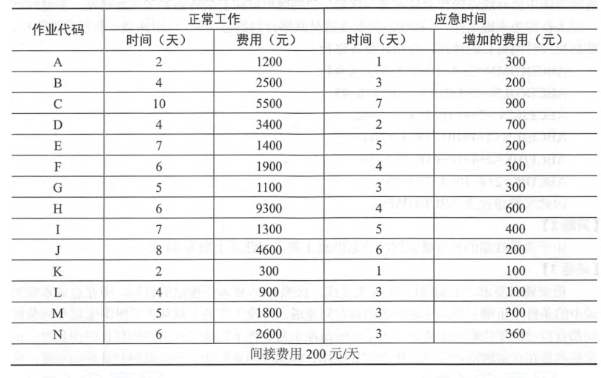 要达到要求则要缩短6天,所以需要先将大于38天的4条路径中某些共同活动进行缩减。在4条路径共同活动中计算。首先从单位增加成本最低的活动开始,单位成本最小依次为J (200/2=100)、N (360/3=120)、B (200/1=200)、C (900/3=300)、A (300/1=300)。首先J可以缩短2天,增加成本200元,还需缩短4天,然后N活动缩短3天,增加成本360元,还需缩短1天。