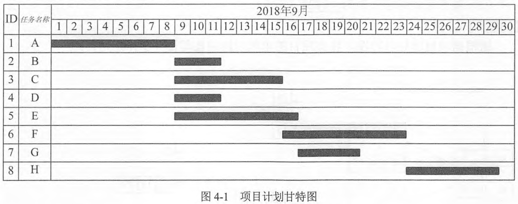 根据项目甘特图,计算各工作的持续时间,并分析每项工作的紧前任务,填入表4-1中。