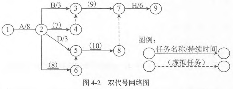 请根据项目计划甘特图,将该项目的双代号网络图即图4-2补充完整。