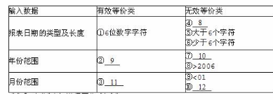 问答题 某公司需开发一套电子商务系统,为保证开发进度和开发质量,专门组建测试小组对开发的全过程进行测试。电子商务系统的报表处理模块要求用户输入处理报表的日期,日期限制在2003年1月至2006年12月,如日期不在此范围内,则显示输入错误信息。系统日期由6位数字字符组成,前4位代表年,后2位代表月。测试小组设计了等价类,如表3-1所示。请根据题目说明及表3-1,填补空9~12。表3-1报表日期输入条件等价类表