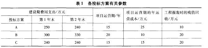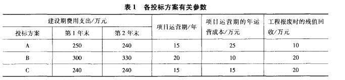 3.假设该工程有效标书经评标专家的评审,其中A、B、C三家投标单位投标方案的 有关参数,见表1。