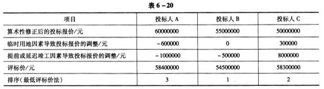 (1)临时用地因素的调整:投标人A:(400-500)*6000=-600000(元);投标人B:(500-500)*6000=0(元);投标人C:(550-500)*6000=300000(元)。