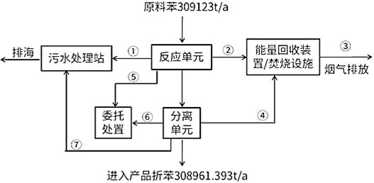 ①废水含苯0.671t/a;②反应尾气含苯0.127t/a;③烟气排放苯0.0018t/a;④分离尾气含苯6.62t/a;⑤固体废物含苯142.5t/a;⑥固体废物含苯11.61t/a;⑦废水含苯0.079t/a。