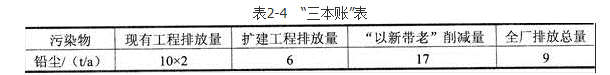 ②根据现有工程污染物排放量推算源强[根据表1,现有工程铅尘去除率为:(4.26-0.34)/4.26=92.1%],单条生产线(25万KV·A·h/a)铅尘源强(即产生量)为:10/(1-92%)=125(t/a),如果将该单条生产线扩能一倍(50万KkV·A·h/a),则源强应该为:250t/a。扩建工程铅尘去除效率为97.7%,则排放量为:250×(1-97.7%)=5.75(t/a)。