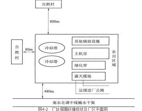 4.(1)露天煤场不合理,厂界南边480m输水渠,运煤公路布置距输水渠太近。图1没有风向,看图上的布置,西边的自然村距离冷却塔太近,噪声的扰民问题可能显得突出。
