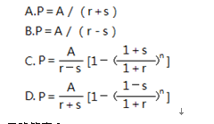 单选题 应用收益法评估某资产价值,已知评估对象每年产生的净收益(A)按等比级数递增,逐年递增比率为s,收益年期无限,折现率r>s>0,则评估值的计算公式为( )。