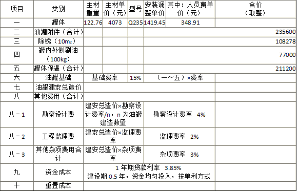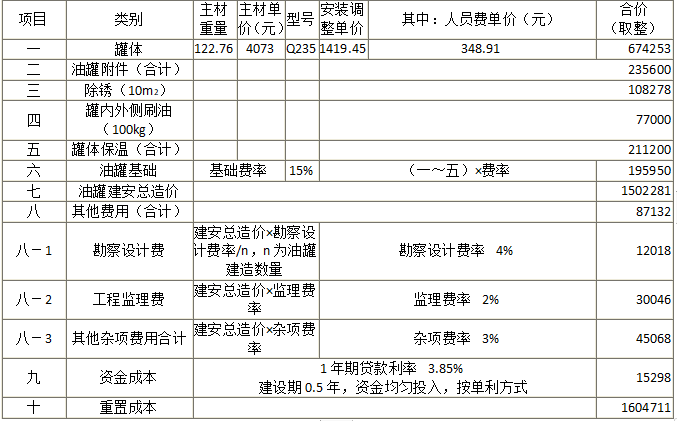 重置成本=油罐建安总造价+其他费用+资金成本=1502281+87132+15298=1604711(元)