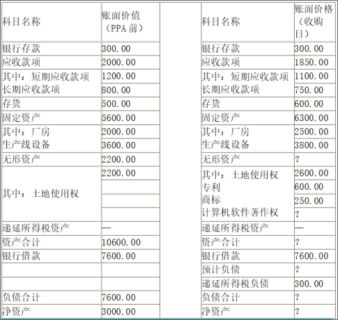 问题5:可辨认资产的公允价值=银行存款公允价值+应收款项公允价值+存货公允价值+固定资产公允价值+无形资产公允价值=300+1850+600+6300+3550=12600(万元)
