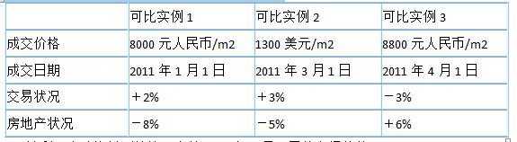 评估对象市场价值(单价)=(8609.76+8642.39+8515.85)/3=8589.33(元人民币/m2)。