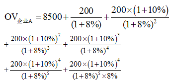 案例题 企业A评估基准日投入资本8500万元,经济增加值第1年为200万元,此后4年每年增长率为10%,从第6年开始经济增加值保持与第5年相同,加权平均资本成本为8%,股权资本成本为7.5%,假设企业收益年期无限。
