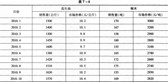 不定项选择题 某粮油零售市场2010年1月至1o月花生油和粳米的销售量及其市场价格如表7—4所示。