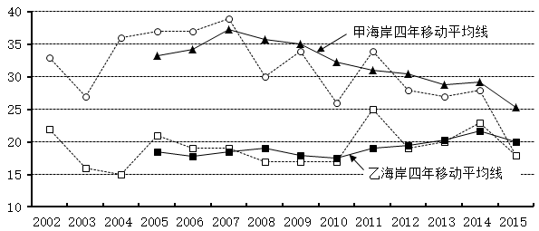 不定项选择题 某地区有甲乙两个海岸,每年都要遭受多次热带风暴的袭击。现有2002~2015年的统计数据,如图1和图2所示。